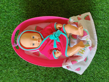 Lay the baby doll in the crib, fold the long side to form a blanket for the baby doll.