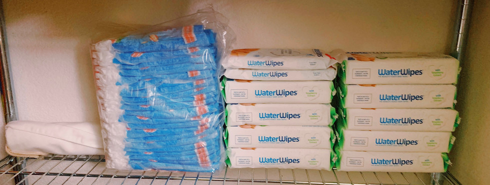 - Back row has overstock wipes. I also keep a pack of diapers to use on daily basis. The remaining diaper box is in storage cupboard.