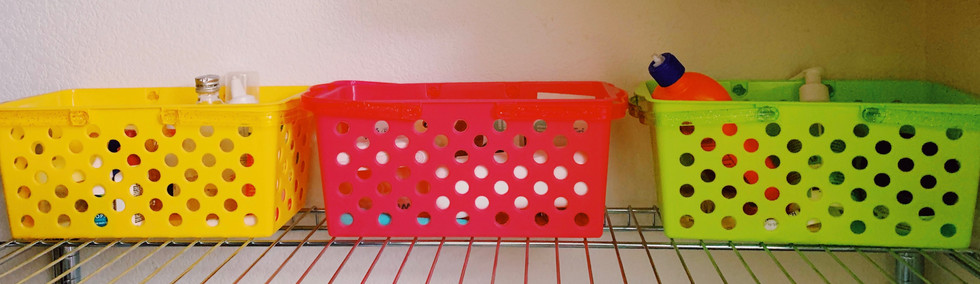 - Back row has 2 baskets with things that I want to be out of reach from Bubu.